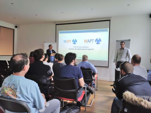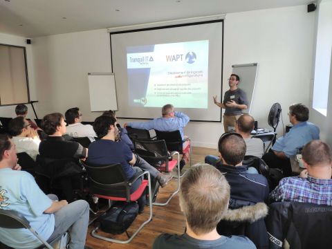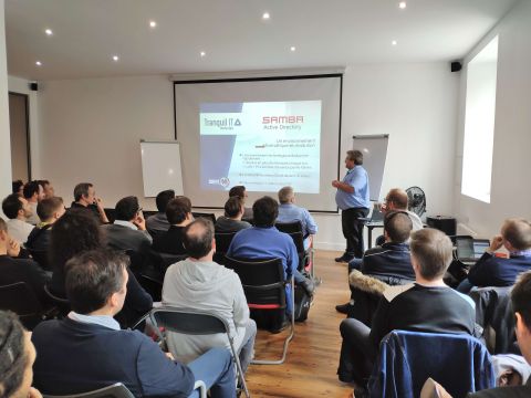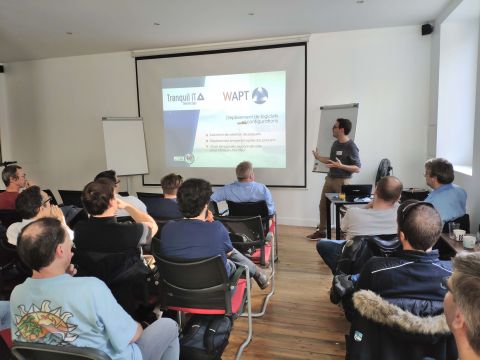 Fue Denis CARDON, director técnico de Tranquil IT, quien comenzó con una presentación sobre Samba Active Directory titulada: «Migrar 170 dominios Samba3 a SambaAD». Luego, le siguió Jérôme COLOMBET del CNRS, quien compartió su experiencia con el software desde 2013. Después de un descanso para merendar, nuestro experto en WAPT, Simon FONTENEAU, tomó la palabra y destacó nuestra solución principal para la gestión de parques informáticos. La tarde de conferencias concluyó con la experiencia compartida por Pierre COSSON y Jean-Jérôme SOUEIX del Inserm, quienes discutieron sobre las necesidades, expectativas y perspectivas antes de implementar WAPT en su empresa. La última parte del día fue una oportunidad para intercambiar ideas durante un cóctel.